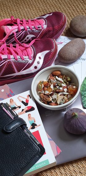 The usual technology, documents, notebooks and reference materials dominate, but also a readily-available source of water and healthy snacks, some elements of nature (these are pebbles from one of my favourite beaches, which I just enjoy holding, as well as making excellent hand stretchers after lots of typing! ) and the ability to fit in lots of gym, yoga and running sessions around my working day.